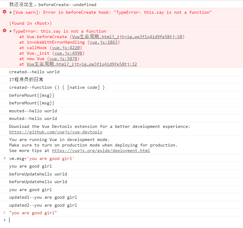 console.log('我还没出生,beforeCreate--'+this.msg);