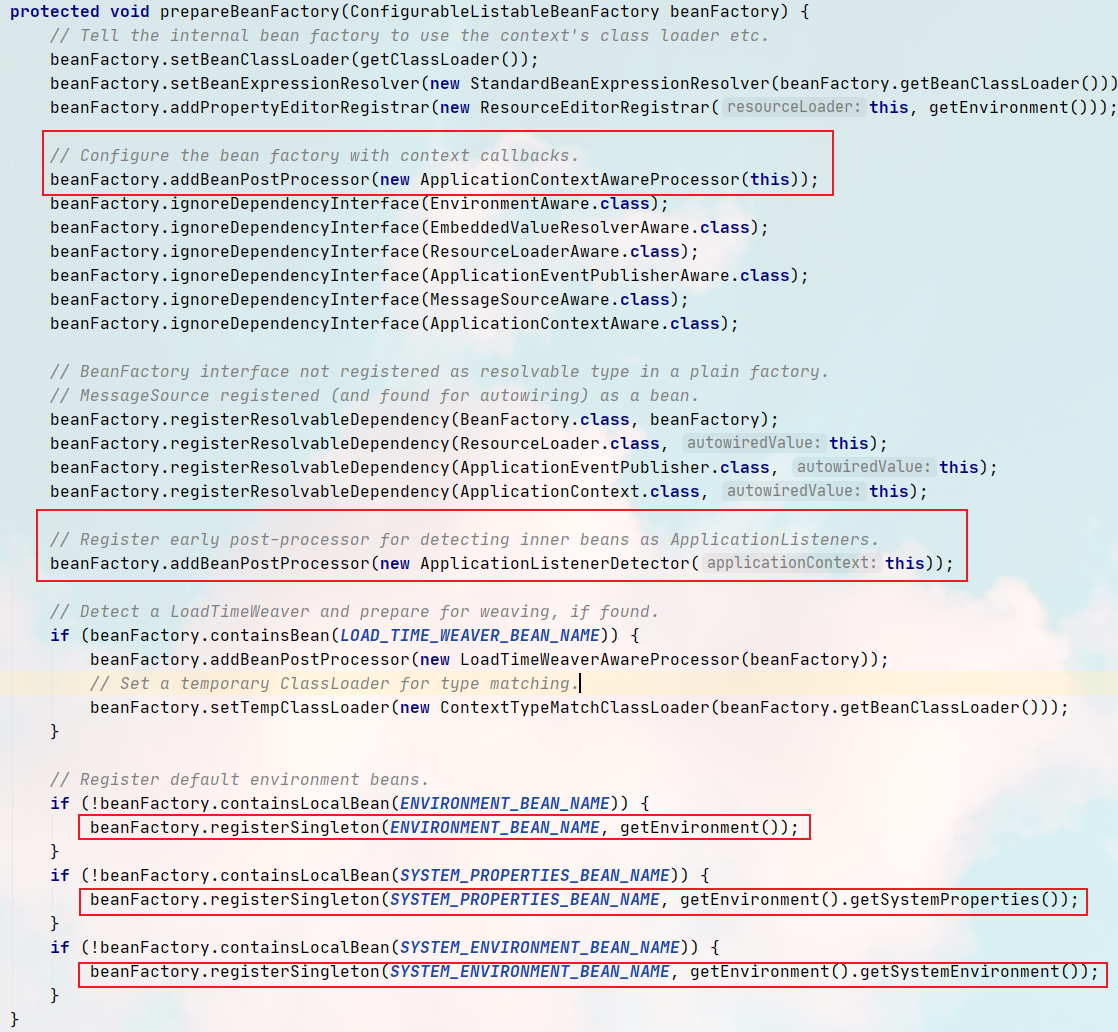 为BeanFactory准备一些环境,方便在实例化的时候使用,同时添加容器自己的BeanPostProcessor