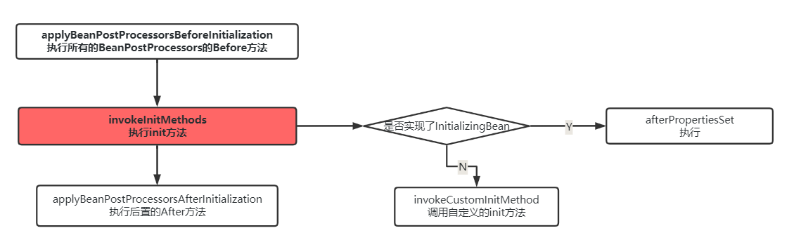 这个就是这个方法的执行流程图,相信到这个地方,大家应该对于为什么BeanPostProcessor的before方法会在init方法执行了解了。这个方法的作用仅仅是用来进行一个生命周期的打印,对象在之前已经创建了。