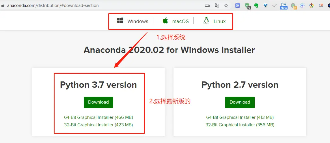 选择最新版本的Anaconda进行下载,要注意选择 64-Bit Graphical Installer. 当然这里指的只是Anaconda的默认Python版本,安装成功后,你可以创建任意版本的Python虚拟环境。