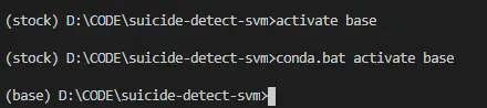 其实两者是一样的原理,均通过conda来控制环境的使用。因为Windows中,输入完activate base后,它会自动补全一句conda.bat activate base, 如下图所示: