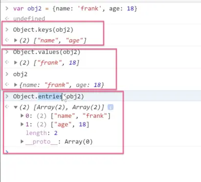 Object.keys(obj2)查看自身特有的keys;Object.values(obj2)查看自身特有的values;Object.entries(obj2)查看自身所有的keys+values;