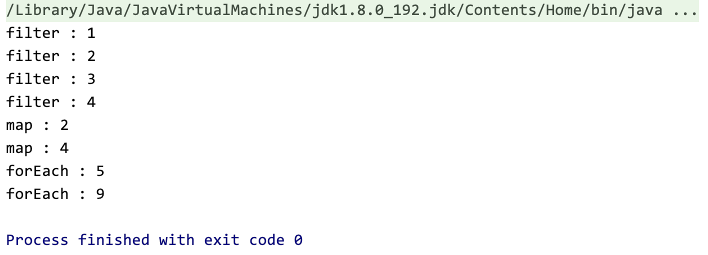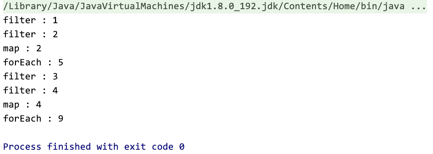 It is obvious that ① and ② have the same output. Before filter(), the collection has been transformed into a lazy sequence, in Chinese "懒序列". In this case, the whole program is like a water pipe, and forEach() is like a water tap, called "terminal operator".