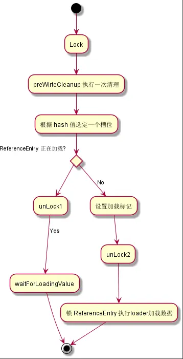 这样的加载过程可以有更好的并发,因为第一个 lock 锁的是 Segment ,粒度是很大的,用来加载过程会大大影响性能。Cache 的方法是,先构建 ReferenceEntry 对象,然后对 ReferenceEntry 上锁(一个 key 一个 ReferenceEntry,粒度极小),再进行加载。那么锁 Segment 的操作是为了构建 ReferenceEntry 对象,并设置一个 Loading 的中间状态,这样可以保证其他过来 get 同一个 key 的线程不会重复加载数据。
