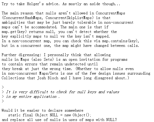 hashMap中是允许key或者value为null的,那么为什么concurrentHashMap不允许呢?其实作者Doug Lea大神亲自解释过:也就是说当get(key)为null,在concurrentHashMap中难以分辨出是不存在这个key对应的value还是本身key对应的value就是null。