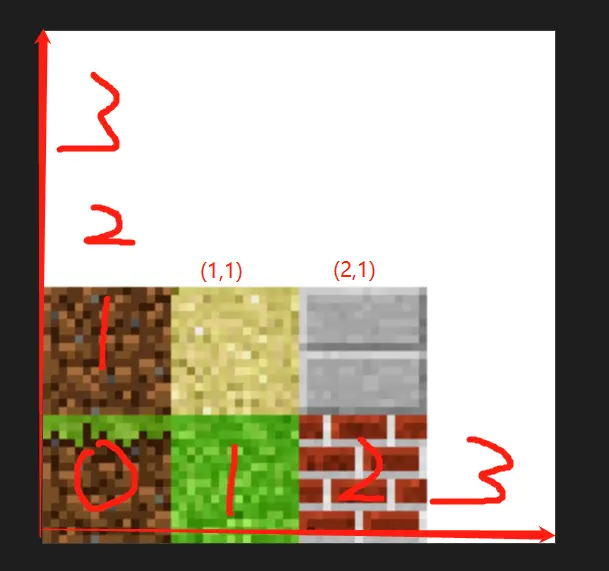 看完tex_coords函数的参数你大概就知道了,这里第一个参数,代表砖块的顶部图像,第二个参数代表底部图像,第三个参数代表四个边的图像。而传入的参数中,(1, 0) 则表示为texture.png 的第(1,0)个图: