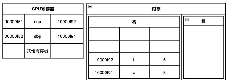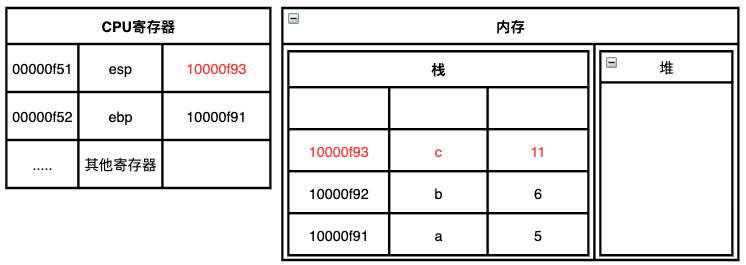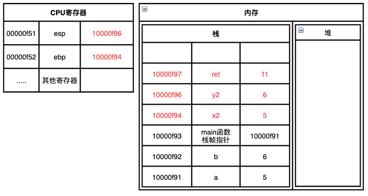 图中用到了两个CPU寄存器,其中esp寄存器始终指向当前栈的栈顶,而ebp寄存器指向的是当前函数的起始位置,函数的起始位置又叫做函数的栈帧指针;因为程序当前正在指向main函数,所以ebp寄存器指向的是main函数的起始位置10000f91。