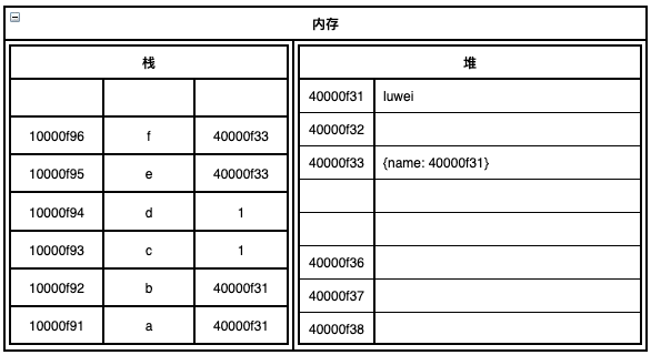 上面的代码在执行到第6步时,内存的分布应该如下图所示: