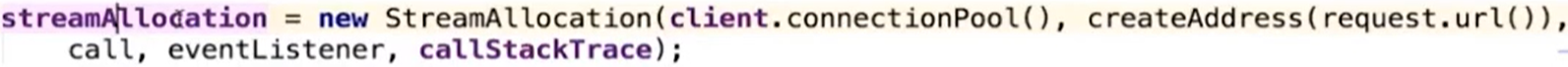 其中创建了streamAllocation,主要用于获取连接服务端的connection和用于服务端进行数据传输的输入输出流。实际使用在connectInterceptor。