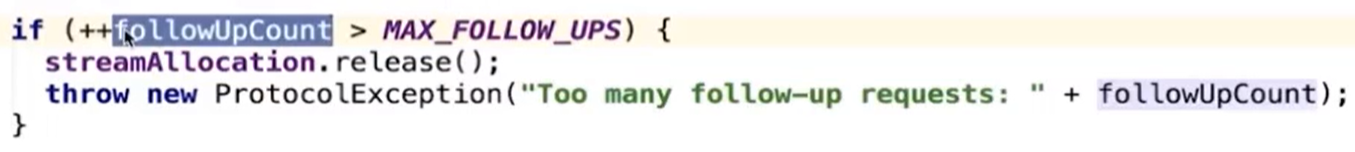followUpCount进行判断,超过最大重连次数(默认20)后,就会释放streamAllocation对象。