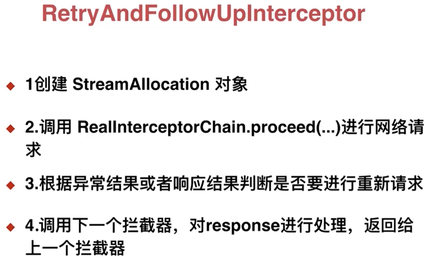 - 该方法构成了一个拦截器链,通过依次执行不同功能的拦截器,来获取服务器的响应返回。