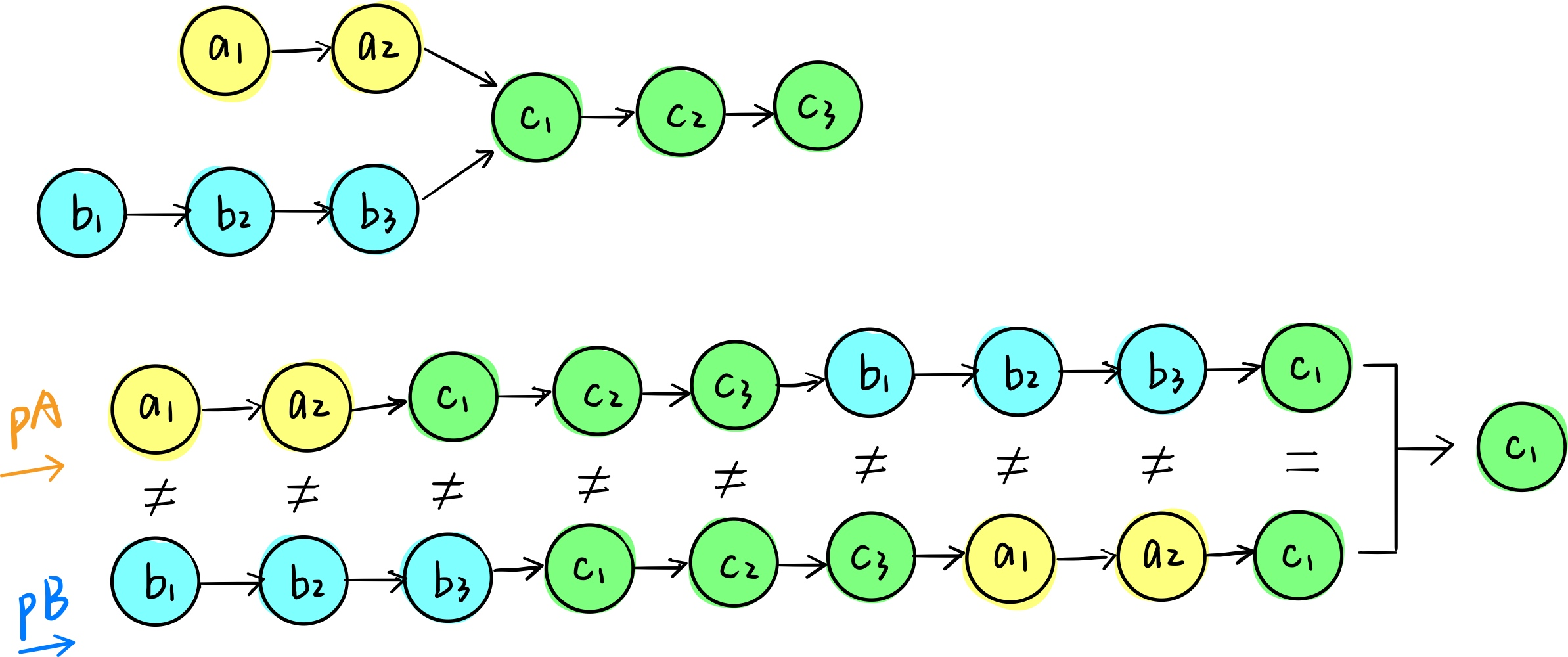 PA = PA ? PA.next : headB // PA遍历完A链表, 立马使PA = headB