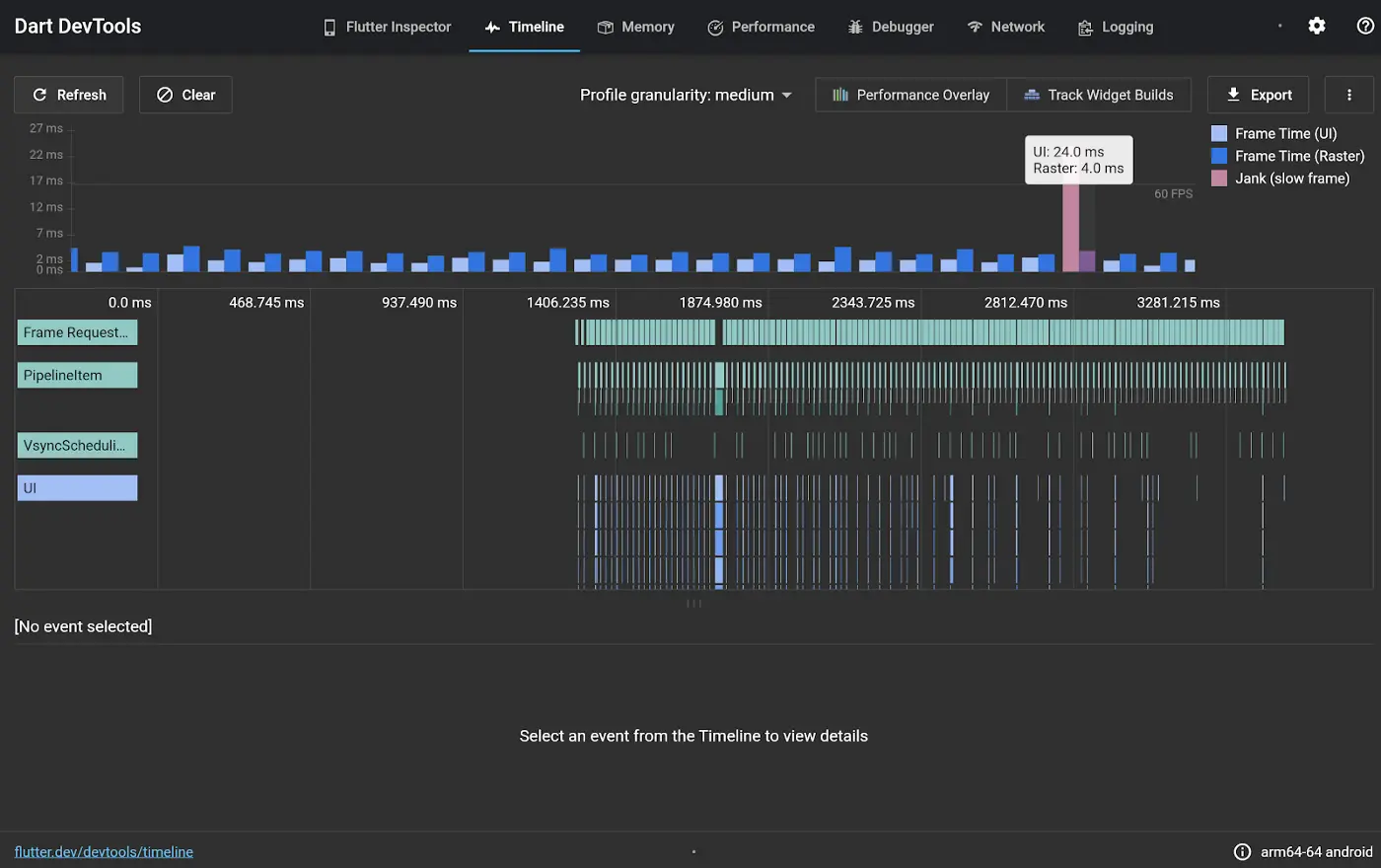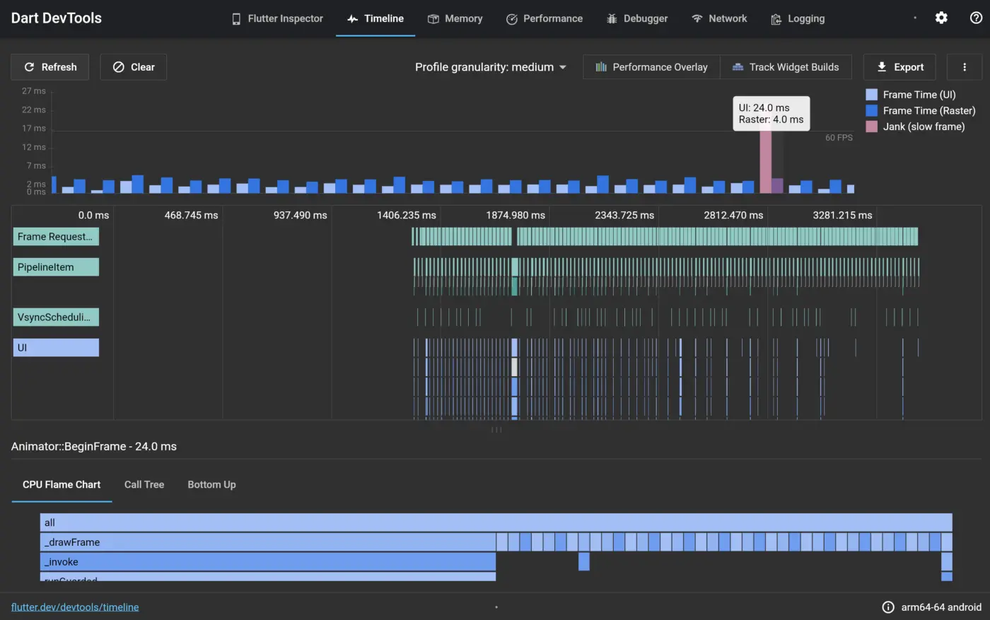 时间线视图现在显示了每个帧的构建时间以及火焰图。这使得它很容易识别有问题的帧,同时在上下文中看到它们。