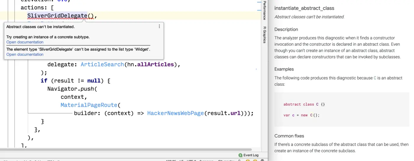 对于最常见的静态错误,IDE会链接到一个较长版本的错误信息,包括示例代码和常见的修复方法。