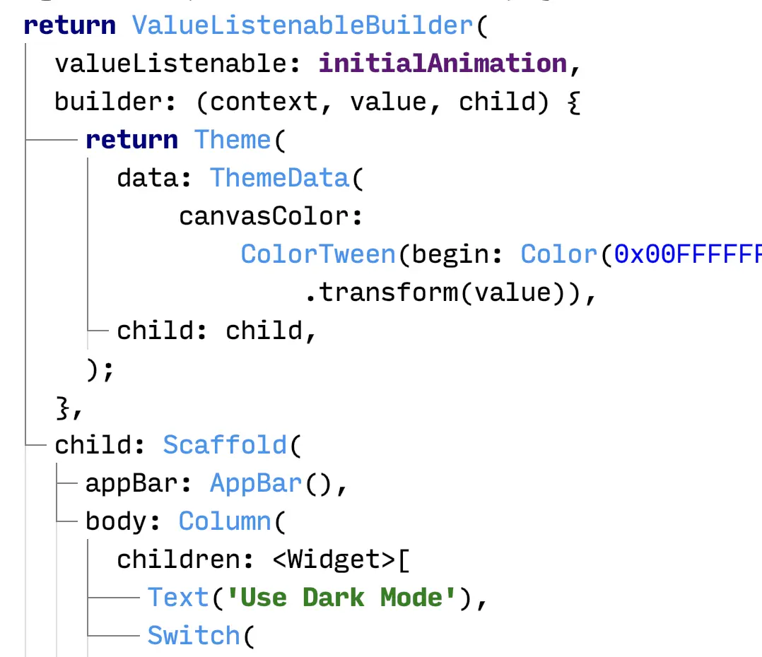 Flutter工具让你更容易处理这样的代码。UI指南突出了你正在构建的widget树。