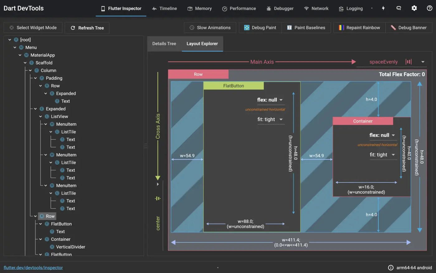 新功能之一是布局资源管理器,您可以在细节树旁边的Flutter检查器标签中找到它。布局资源管理器让你检查Flutter的柔性布局模型。例如,当你不确定为什么一排widget看起来不是你预期的方式,或者为什么你得到 "RenderFlex溢出了42个像素 "的错误时,这可以成为救命稻草。