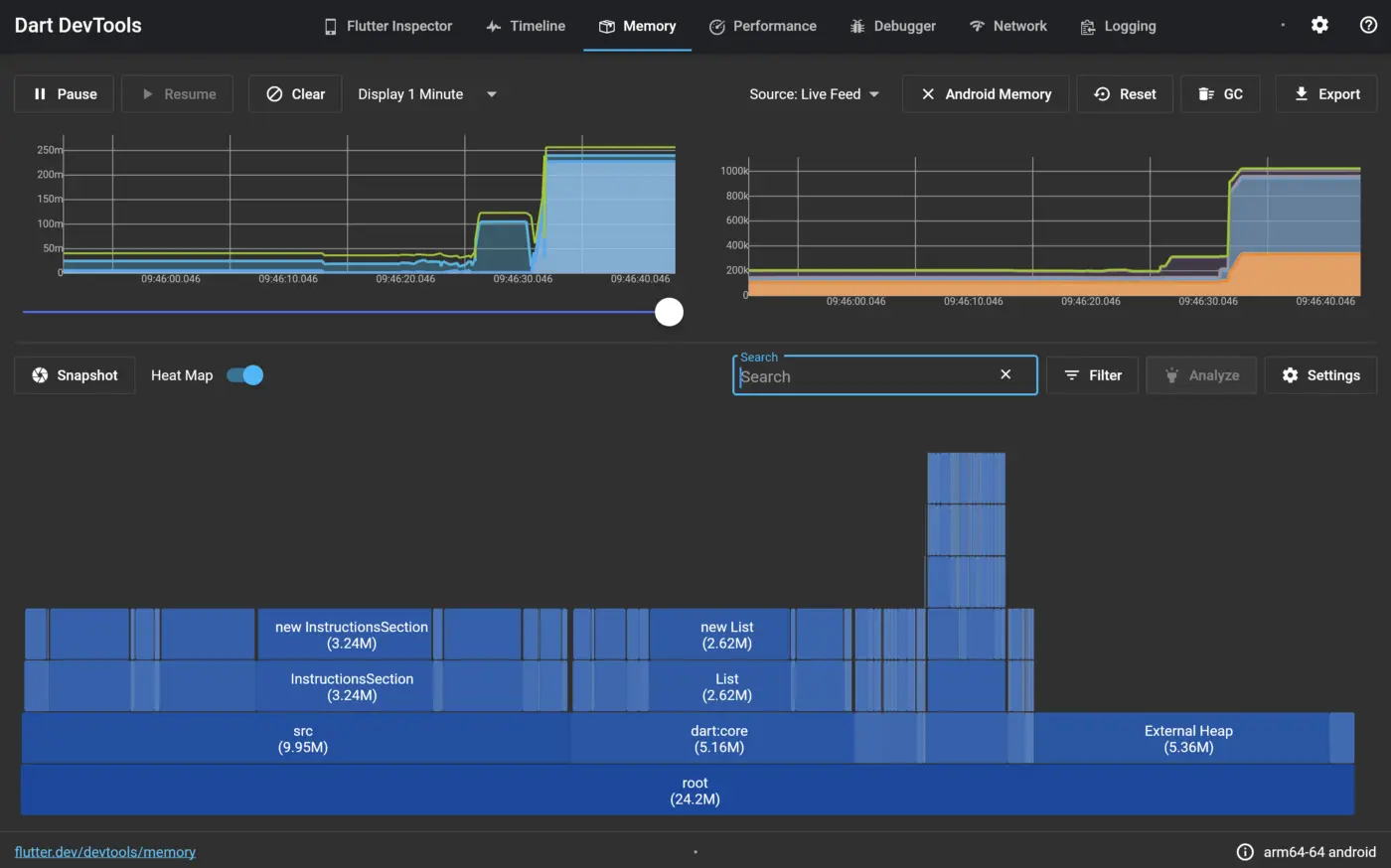 内存视图可以让你窥视你的应用程序在特定时刻的内存使用情况。该视图现在显示了分配内存的热图,并允许跟踪平台内存。