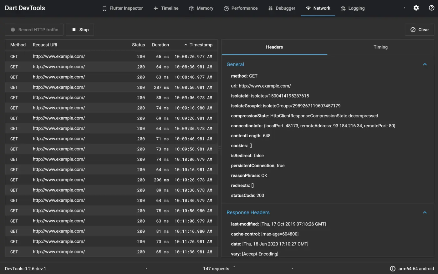 下一个选项卡是全新的。网络视图让你检查,你猜对了,网络流量。你可以看到你的应用程序自启动以来的全部请求历史,以及每个请求的详细信息。这让你在试图调试网络问题时,不必再自行记录这些事件。网络选项卡目前显示的是HTTP流量;未来的改进包括显示一般的套接字I/O流量。