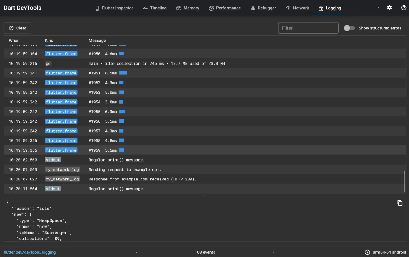 日志视图显示来自你的应用程序和框架的事件。有了它,你可以轻松地过滤消息(例如,你可以指定-gc来过滤掉Garbage Collector事件,或者flutter.frame来只显示frame事件)。在Dart中,日志消息可以被结构化,而日志视图就利用了这一点。