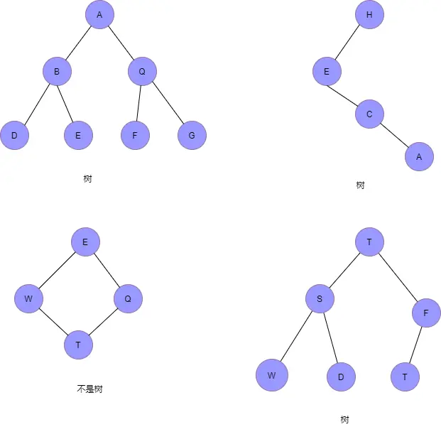 其中,第一、二、四个都是树,第三个不是。树的特点很明显吧!