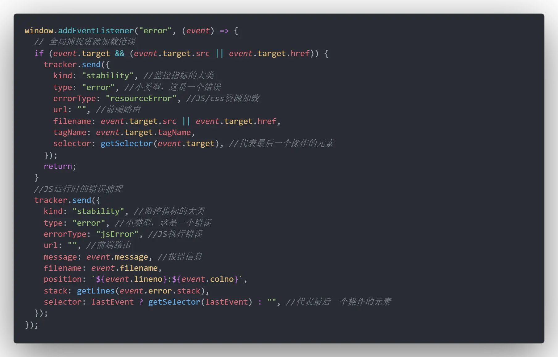 1. 可以捕捉资源加载错误,(这里指的是全局捕捉,当个标签如img也可以使用onerror捕捉到加载错误,详见mdn)