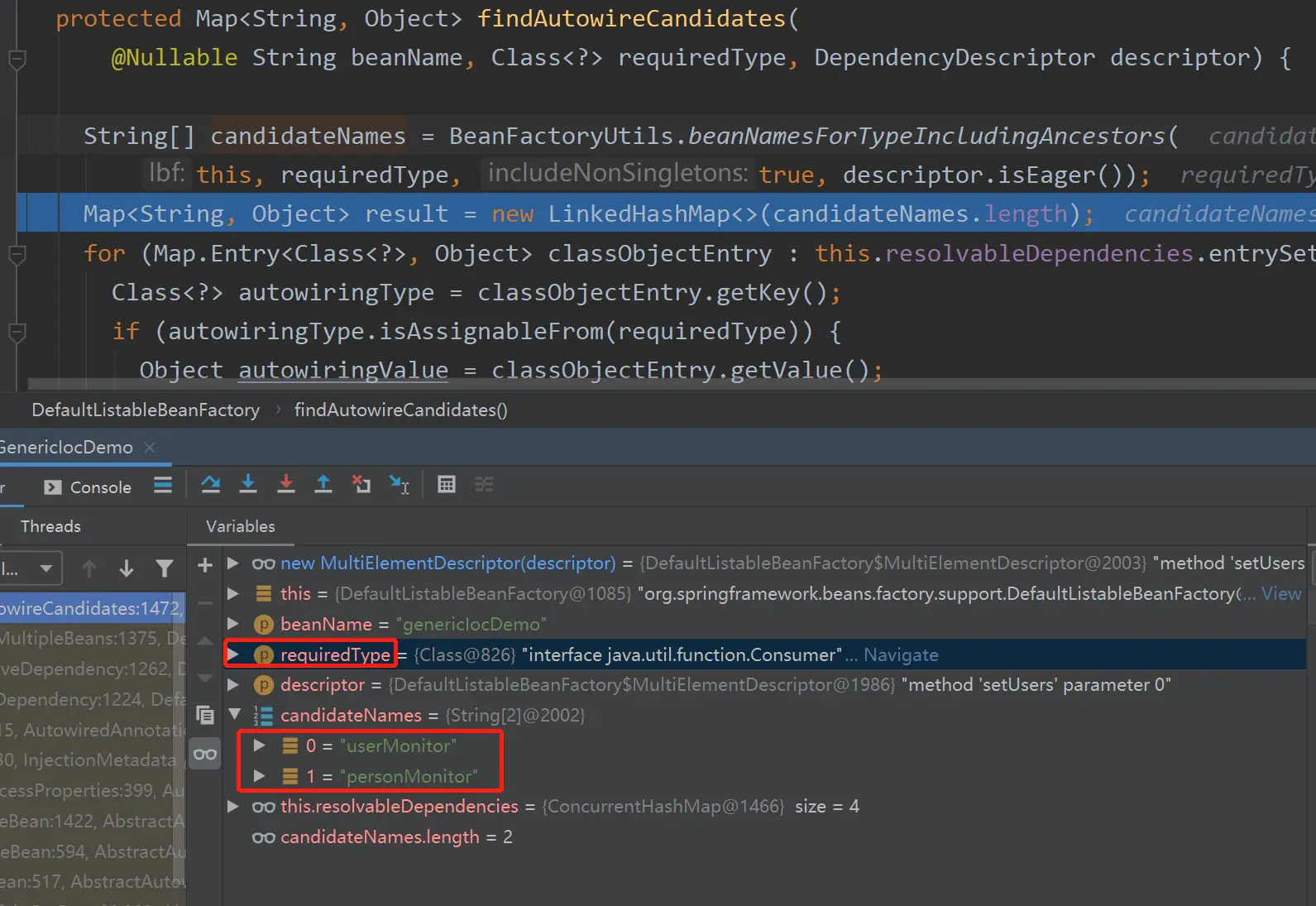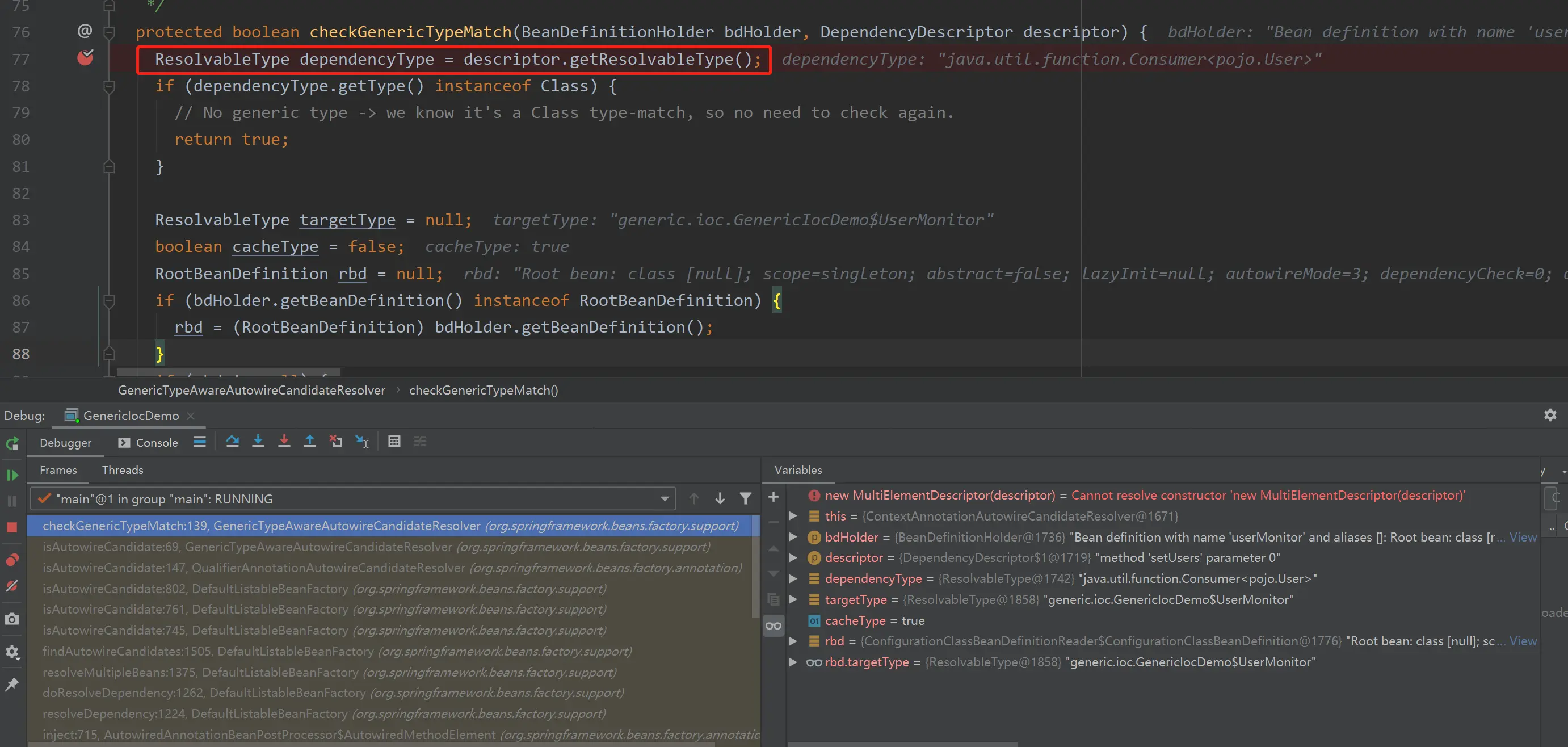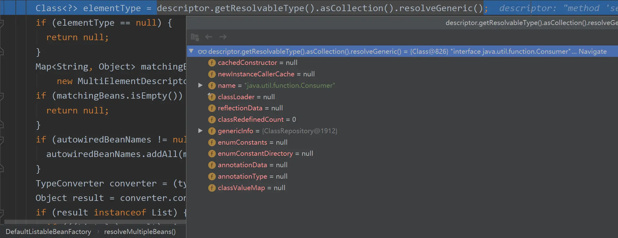 demo 中注入 private List<Consumer> users,只会注入 UserMonitor 类型的 bean,这个过程涉及到一定涉及到泛型的判断,判断都是通过 ResolvableType 实现的,可以一窥 spring 的使用场景。下面是 spring 处理的主要流程。