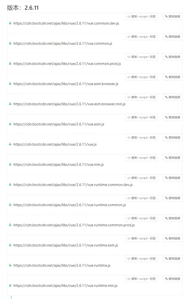 以bootcdn为例,我们可以看到,vue有许许多多不同的版本。