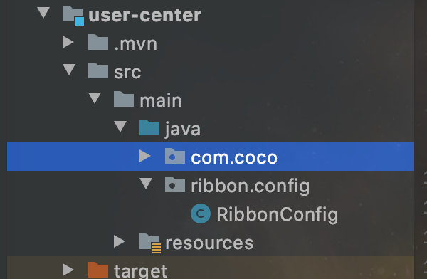 然后编写RibbonConfig.class类,但是切记,这个类一定要在SpringBoot启动类之外,这里涉及到Spring的父子上下文,如果写在启动类里面,那么就会被重复扫描,因为Ribbon也有一个自己的上下文。如果被重复扫描会有意想不到的问题。