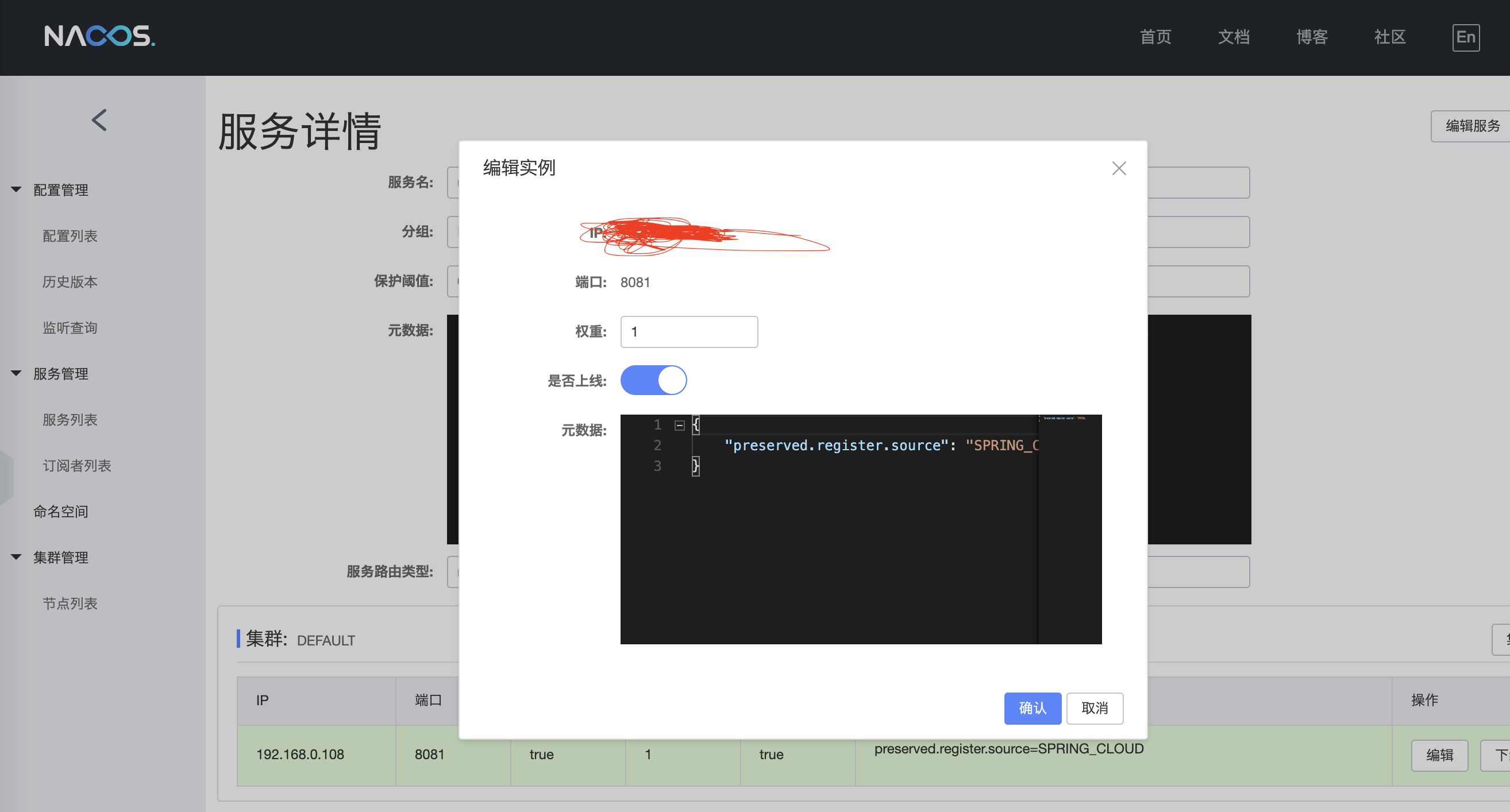 * 服务管理->服务列表->(选择某一个服务)详情->集群配置->编辑->权重