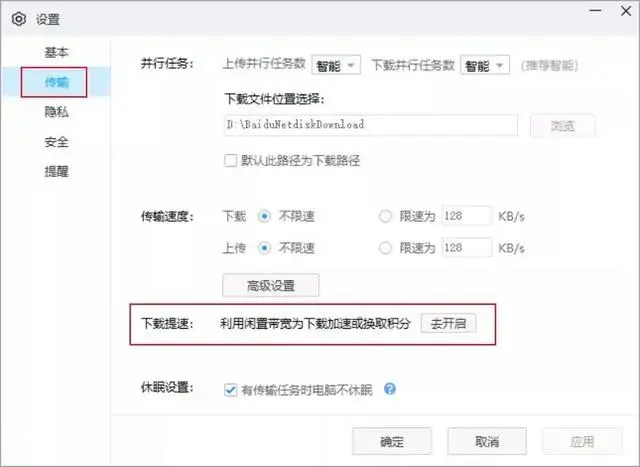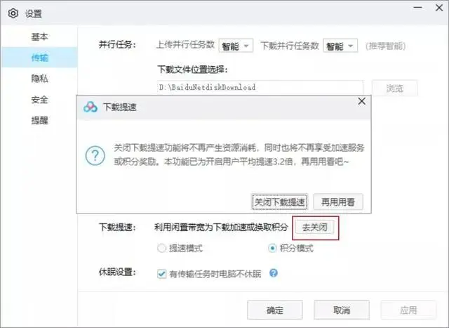 更新到最新PC客户端后,打开百度网盘-设置-传输-下载提速,点击“去开启”,就可以打开新的「提速模式」了。