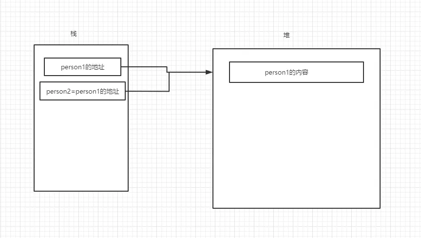- 这个时候在对 person2 进行赋值的时候,赋值的不是内容,而是栈中的地址,这个时候 person1 和 person2 都指向一个内容