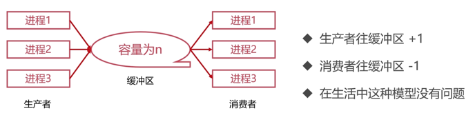 当生产者生产了一个产品之后,缓冲区里的产品就会+1,同样,如果消费者从缓冲区里边消费一个产品,缓冲区里的产品就会-1,在生活中这种模型是没有问题的(比如生产手机的工厂,流水线上生产完一个手机,就会放在仓库里边,消费者从仓库中取出手机消费,这个生产者-消费者模型从宏观的角度上看没有问题)