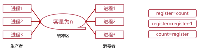 这三步就是就是我们操作缓冲区必须的三个步骤。我们就可以将缓冲区看作是仓库,将register寄存器看作是生产者的地方或者消费者的地方,这个模型我们乍一看,好像也没什么问题
