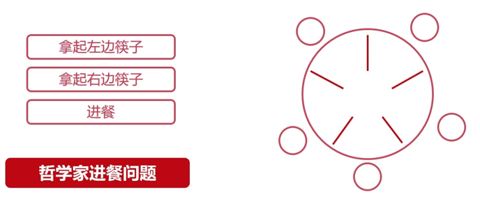 那么这个过程为什么也需要进程同步呢?可以想象一下哲学家进餐的时候会出现什么样的情况,假设在这个时候某一位哲学家饿了,他需要拿起左边的筷子和右边的筷子进行吃饭。这个时候,第一步,拿起左边的筷子,第二步,拿起右边的筷子,假设此时他发现右边的筷子被拿了,那么他就会等待右边的筷子释放,筷子释放后,他拿起右边的筷子,开始吃饭。这就是哲学家吃饭的时候可能会面临的问题,这样一看,好像没有什么问题。