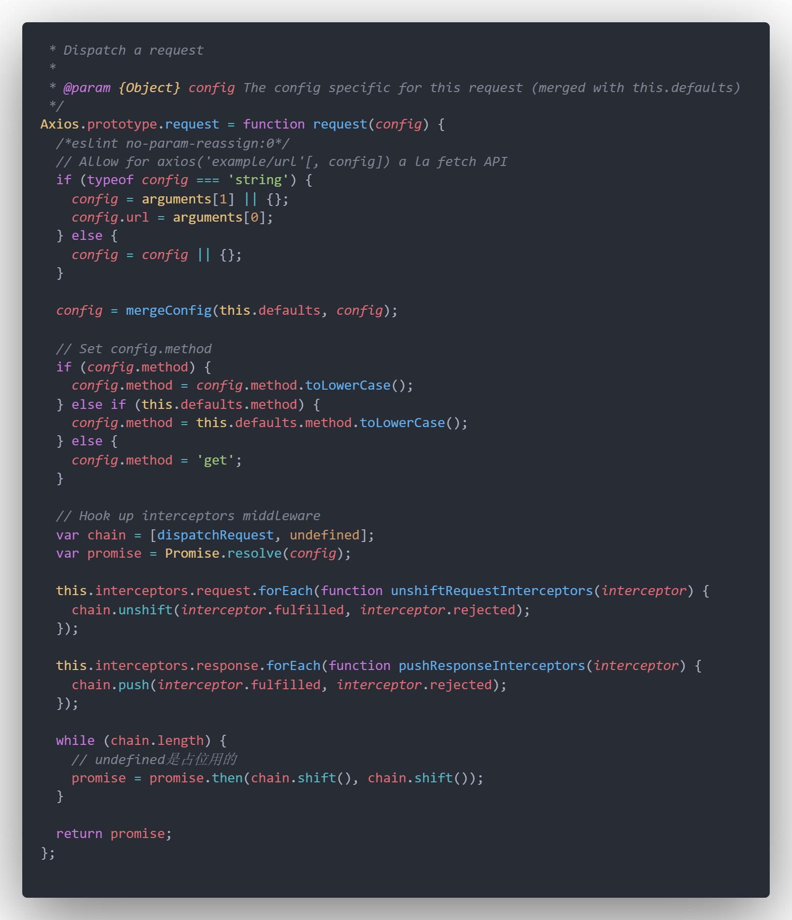 可以看出内部使用了名为chain的数组,在发起网络请求前,取出interceptors对象中request和response实例中存储的fulfilled与rejected函数。