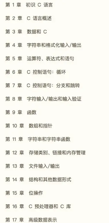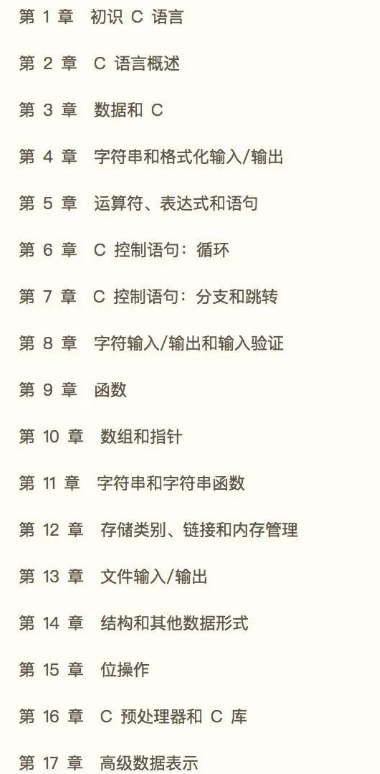 - 第16章、17章介绍C预处理器、C库和高级数据表示
