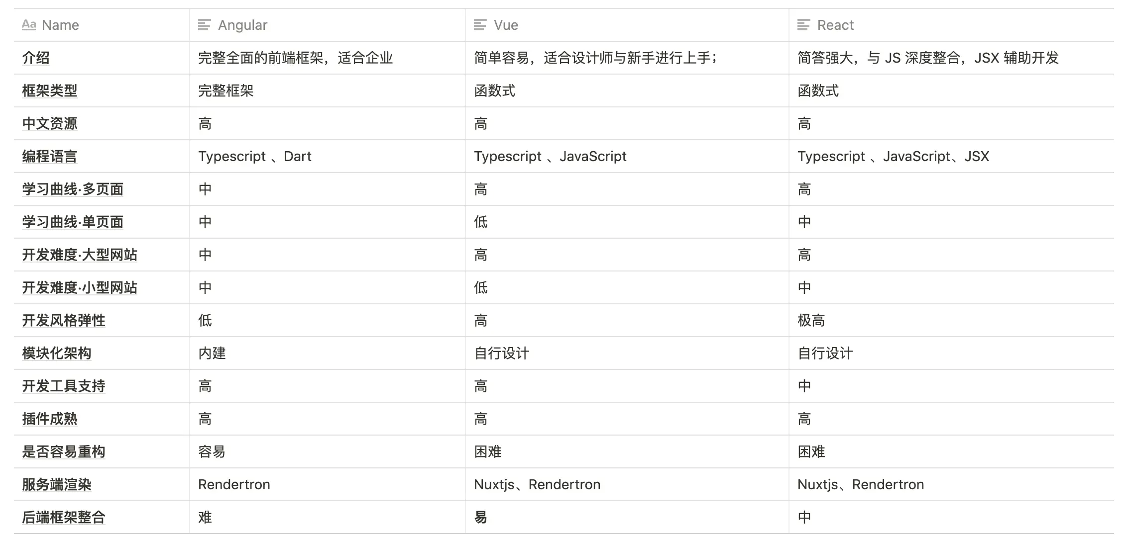 这个对比表应该可以代表大部分人对于三大前端框架的理解。