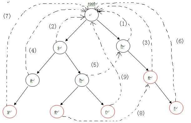 从代码观察下构造失败指针的流程:对照下图来看,首先root的fail指针指向NULL,然后root入队,进入循环。第1次循环的时候,我们需要处理2个节点:root->next[‘h’-‘a’](节点h) 和 root->next[‘s’-‘a’](节点s)。把这2个节点的失败指针指向root,并且先后进入队列,失败指针的指向对应图中的(1),(2)两条虚线;第2次进入循环后,从队列中先弹出h,接下来p指向h节点的fail指针指向的节点,也就是root;进入第13行的循环后,p=p->fail也就是p=NULL,这时退出循环,并把节点e的fail指针指向root,对应图中的(3),然后节点e进入队列;第3次循环时,弹出的第一个节点a的操作与上一步操作的节点e相同,把a的fail指针指向root,对应图中的(4),并入队;第4次进入循环时,弹出节点h(图中左边那个),这时操作略有不同。在程序运行到14行时,由于p->next[i]!=NULL(root有h这个儿子节点,图中右边那个),这样便把左边那个h节点的失败指针指向右边那个root的儿子节点h,对应图中的(5),然后h入队。以此类推:在循环结束后,所有的失败指针就是图中的这种形式。