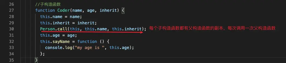 一次是在创建子类型原型的时候(Coder.prototype = new Person()), 另一次是在子类型构造函数内部(借用构造函数call)