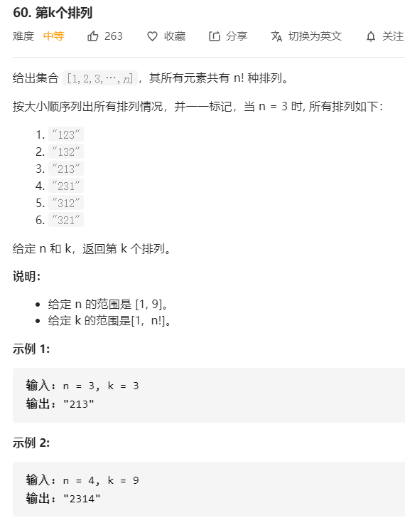 然后就是要确定第 1 位(第二个数字),依旧是从小到大枚举: 假设第 1 位填 1,那么剩下没填的位数有两位,剩下的排列数就是 2! = 2, 2 < k (k现在是4) 因此第 1 位 不是填1 ,跳过第 1 位填 1 的所有排列, k 再更新一下:k -= 2! , 现在 k 的值是 2。 那再假设第 1 位填 3 (由于2已经用过了,所以跳过 2),第 0 位 填 2、第 1 位填 3 的排列数为 2, 2 >= k, 所以我们可以确定第 1 位 填3。