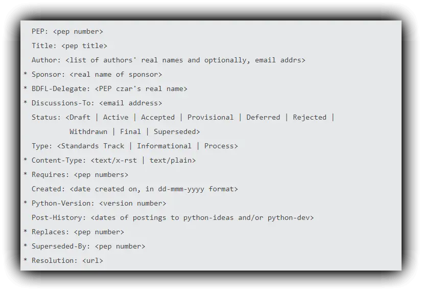 PEP 12--Sample reStructuredText PEP Template,没错PEP12是介绍rst格式PEP模板的PEP(有点绕),为什么要用rst格式?官方给出的解释是 容易转成html进行在线发布和阅读 - 每一篇PEP必须有一个标准的PEP头部,如下所示,带* 号是可写可不写的,不带* 号的是必须要写的,记住写PEP头的时候,头的各个字段的顺序,必须按照下图的内容去写,先后顺序不能乱