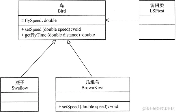 程序运行错误的原因是:几维鸟类重写了鸟类的 setSpeed(double speed) 方法,这违背了里氏替换原则。正确的做法是:取消几维鸟原来的继承关系,定义鸟和几维鸟的更一般的父类,如动物类,它们都有奔跑的能力。几维鸟的飞行速度虽然为 0,但奔跑速度不为 0,可以计算出其奔跑 300 千米所要花费的时间。
