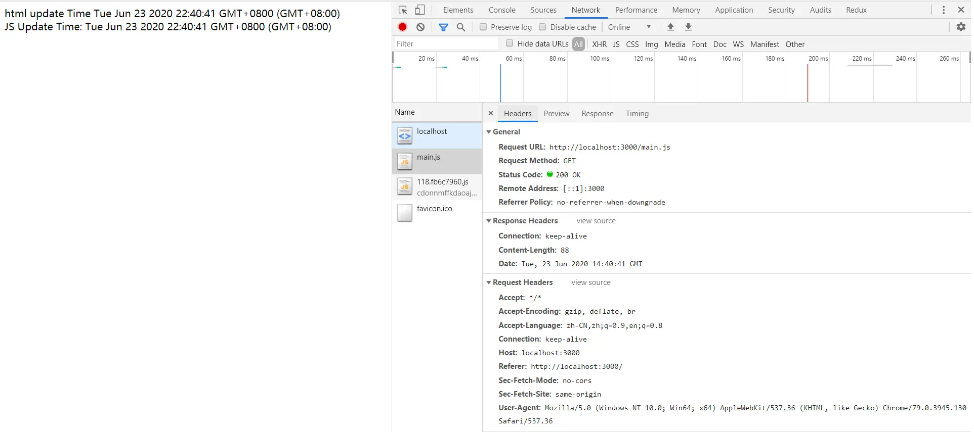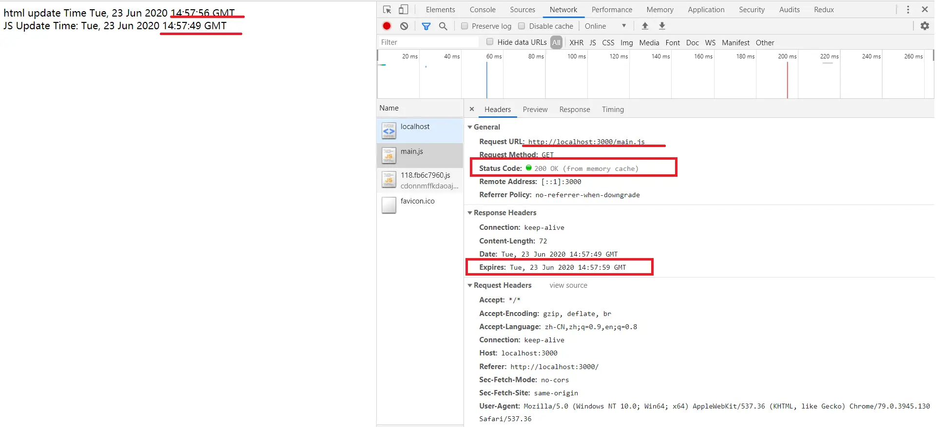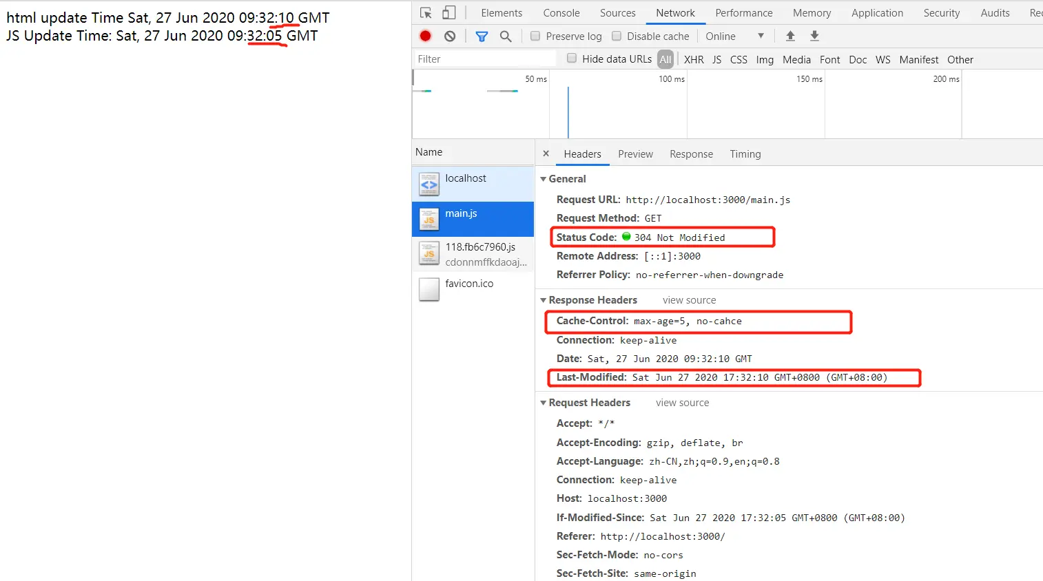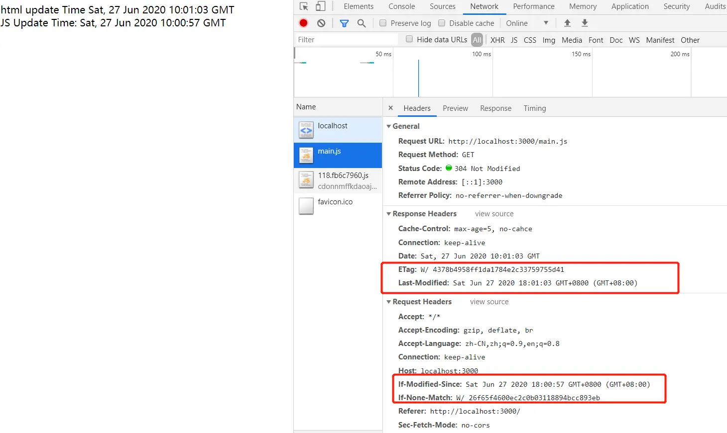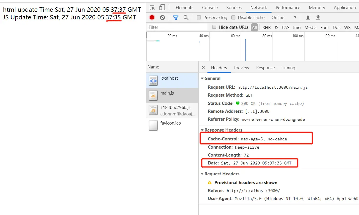 通过 node index.js 启动服务, 并在浏览器中访问 localhost:3000, 打开 network, 取消 Disable cache 并刷新浏览器, 会发现 html 和 js 的更新时间是同步的, 右侧请求返回的状态码是 200