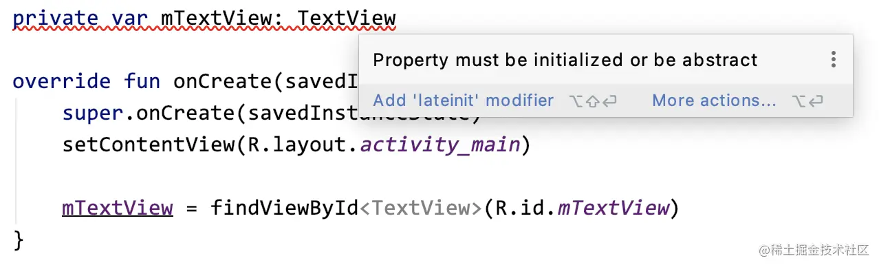 For security consideration, we should tell whether mTextView is initialized or not before using it. Kotlin, since 1.2, provides a new feature to co-operate with lateinit to determine variables's initialization state.