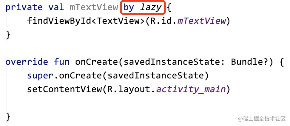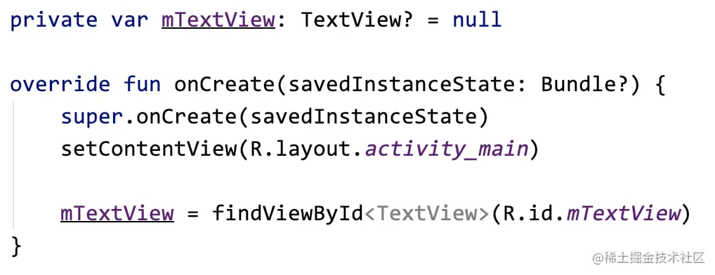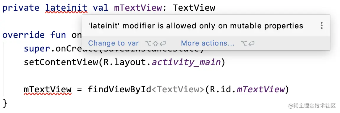By using this key word, the mTextView must be a var, or codes pops an error, which reads "'lateinit' modifier is allowed only on mutable properties"