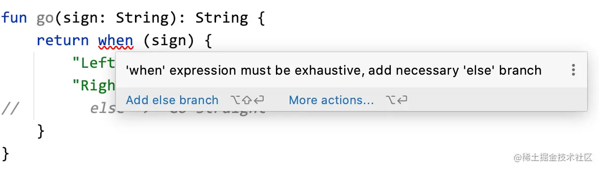 While we use enum class in when, as long as we put all enums in when cases, else option should be ignored. Well this is easy to understand because enums are all here, there is no more else.
