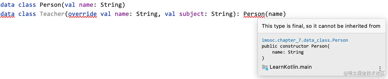 Code above actually reveals that because data class has its own 'equals()' and 'hashCode()' function, once it is able to be extended, it cannot obey symmetry and transitivity of equality, in Chinese "无法遵守等式的对称性和传递性".