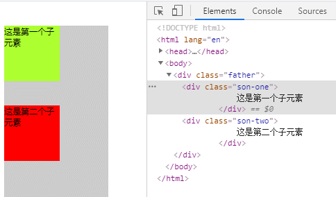 <!DOCTYPE html><html lang="en"><head> <meta charset="UTF-8"> <meta name="viewport" content="width=device-width, initial-scale=1.0"> <title>margin重叠和坍塌</title> <style> body{ font-size: 10px; } .father{ width: 150px; height:250px; background-color: #cccccc; margin-top: 20px; } .son-one , .son-two{ width:80px; height:80px; } .son-one{ background-color: greenyellow; margin-top:40px; margin-bottom: 35px; } .son-two{ background-color:red; margin-top:10px; margin-bottom:20px; }