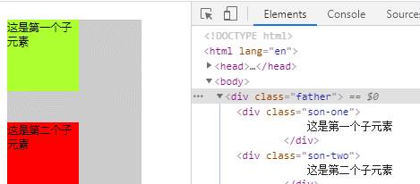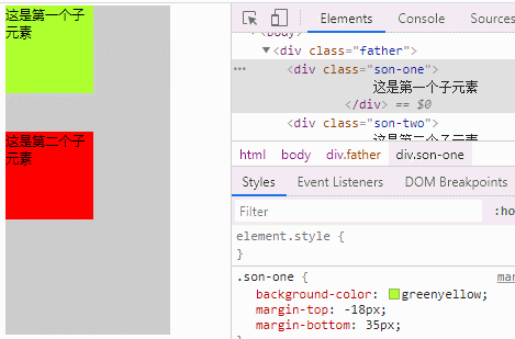 .father{ width: 150px; height:250px; background-color: #cccccc; margin-top: 20px; } .son-one{ background-color: greenyellow; margin-top:10px; margin-bottom: 35px; }这时父元素距离浏览器的顶部20px
