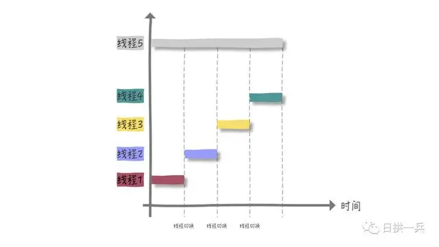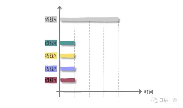 由于是单核 CPU,所有线程都在等待 CPU 时间片。按照理想情况来看,四个线程执行的时间总和与一个线程5独自完成是相等的,实际上我们还忽略了四个线程上下文切换的开销